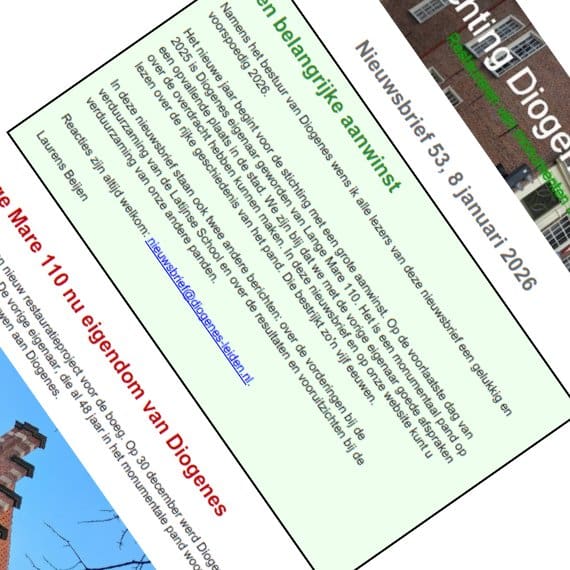 Nieuwsbrief 53 van Diogenes werd verstuurd op 8 januari 2026. Het belangrijkste nieuws was de verwerving van Lange Mare 110 door de stichting. Het is een monumentaal pand op een opvallende plaats in de stad. Met de vorige eigenaar zijn… Verder lezen →