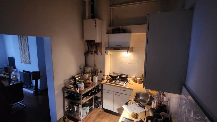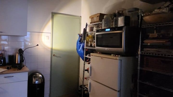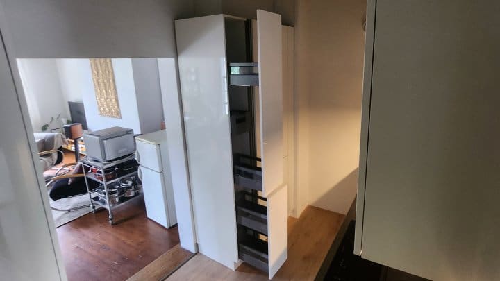 Een deel van de keuken na de verbouwing. Rechts zicht op de hal en de slaapkamer.