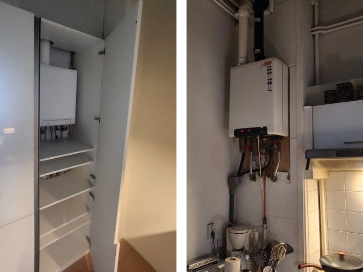 De cv-ketel is vervangen en weggewerkt in een kast. Rechts ter vergelijking de oude situatie.