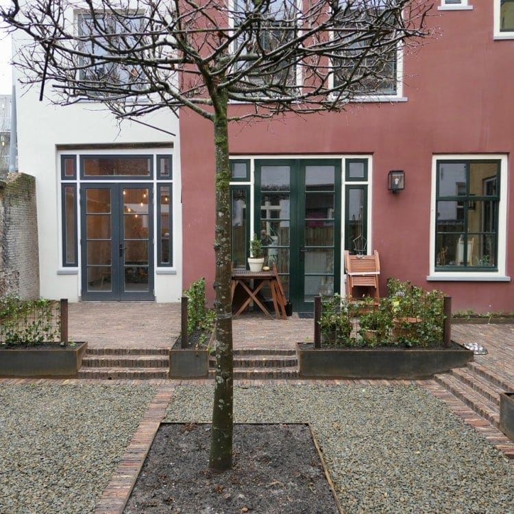 De inrichting van de tuin achter de panden aan de Hogewoerd is bijna klaar. Het puin is weggehaald, de woningen hebben een eigen terras gekregen, het gemeenschappelijke deel is voorzien van een halfdoorlatende verharding en er is een boom geplant. Aan de kant van de Koenesteeg is een tijdelijke schutting geplaatst die na de restauratie van Hogewoerd 63 zal worden vervangen door een stenen muur. De oude tuinmuur zal nog worden versterkt en verbeterd en er zal een fietsenstalling worden geplaatst.