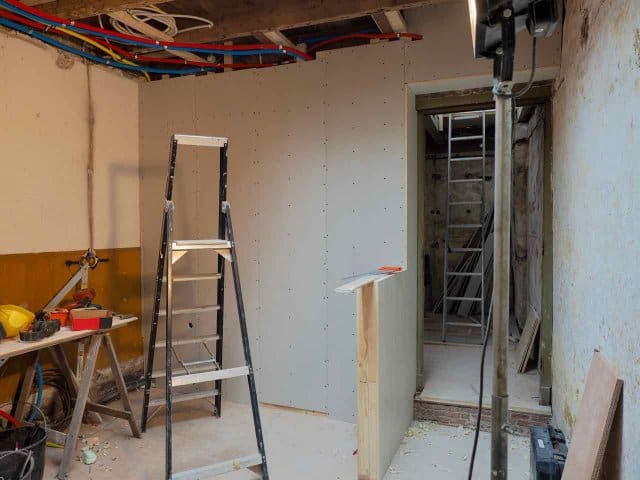 De binnenmuren, behalve die van de natte ruimten, worden bekleed met houten delen.