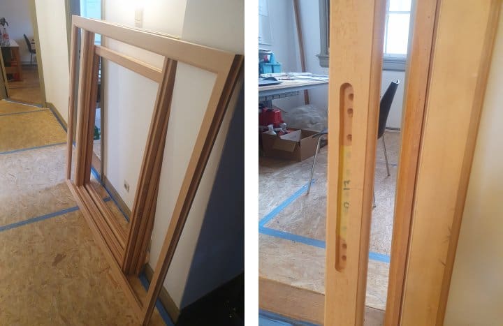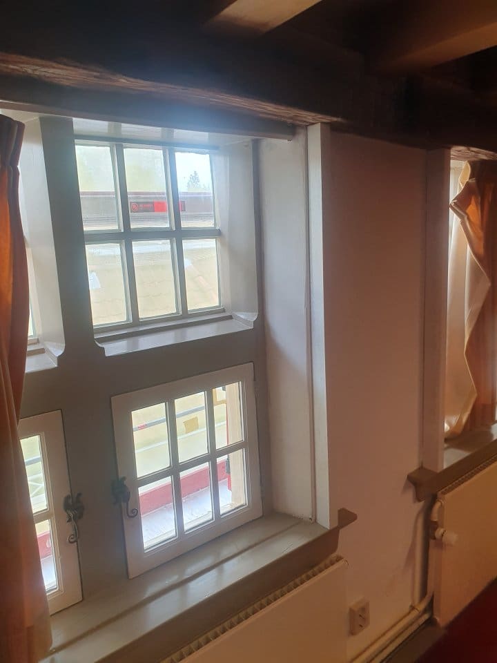 Vooral op de rechterfoto is te zien dat de oude kozijnen niet precies rechthoekig zijn. Bij de verbouwing worden eerst de oude ramen eruit gehaald, daarna worden de nieuwe ramen goed passend en ook schuivend gemaakt en dan worden de oude ramen tijdelijk teruggeplaatst. De nieuwe ramen gaan dan naar de werkplaats van de schilder, waar het glas en de roeden geplaatst worden en het raam geschilderd wordt.