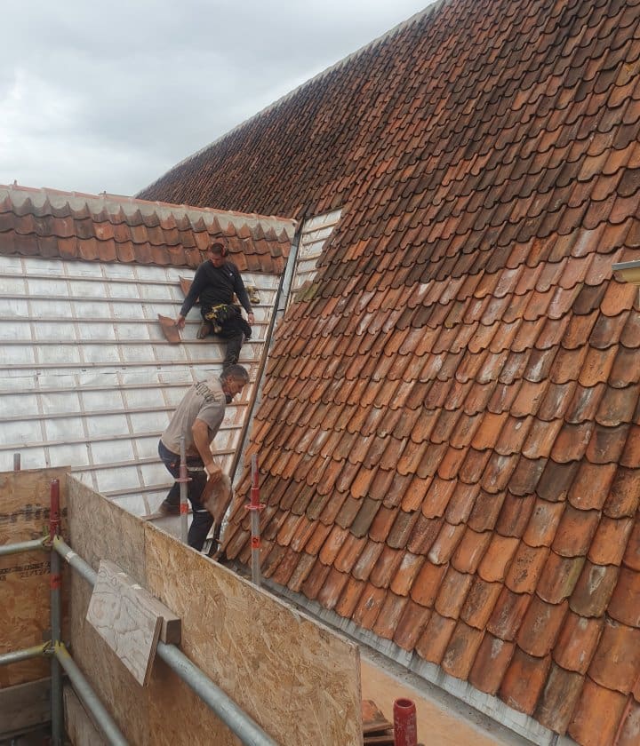 De laatste dakpannen worden gelegd. Omdat vrij veel oude dakpannen beschadigd waren, zijn voor de vakantie “nieuwe” gebruikte pannen besteld.