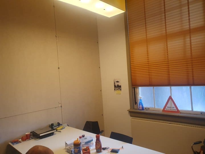 Een werkbank van de aannemer in een van de kantoorruimtes om daarop aan de ramen te werken.