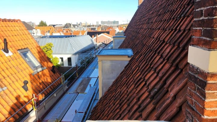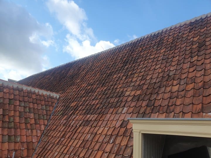 De laatste pannen zijn nu op het dak gelegd. Alleen de bliksembeveiliging moet nog op de nok worden aangebracht.
