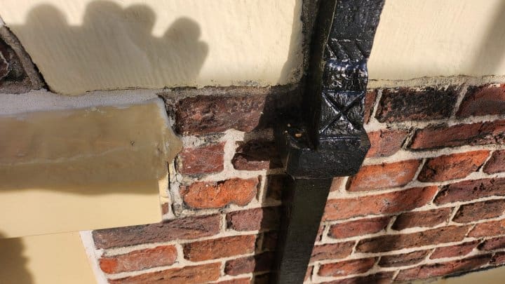 Sommige onderdorpels van kozijnen waren gedeeltelijk verrot, onder andere door optrekkend vocht uit de muur. Hier is een deel van de onderdorpel en een stuk van de zijstijl uitgezaagd om ze te vervangen door nieuw hout.