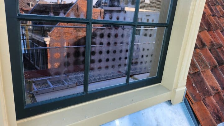 Er is vacuümglas toegepast met een ultradunne spouw. De uitstekende warmte-isolatie van vacuümglas zorgt ervoor dat de buitenruit koud blijft. In het voor- en najaar condenseert de vochtige buitenlucht vaak in de vroege ochtend op koude oppervlakken.