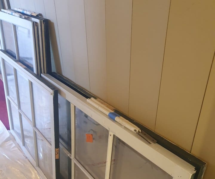 Enkele andere ramen staan nog klaar. Het glas is al geplaatst en ze zijn al geschilderd: wit aan de binnenkant en groen aan de buitenkant.