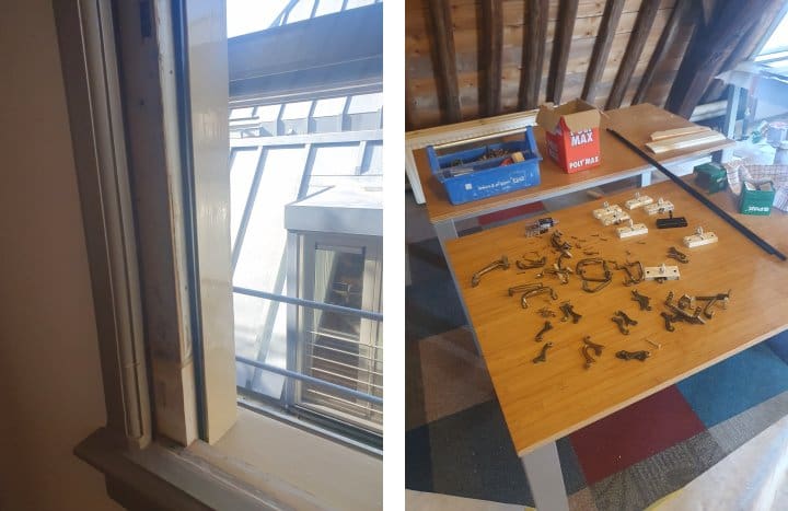 Rechts: raambeslag van de oude ramen is schoongemaakt en ligt klaar voor hergebruik.