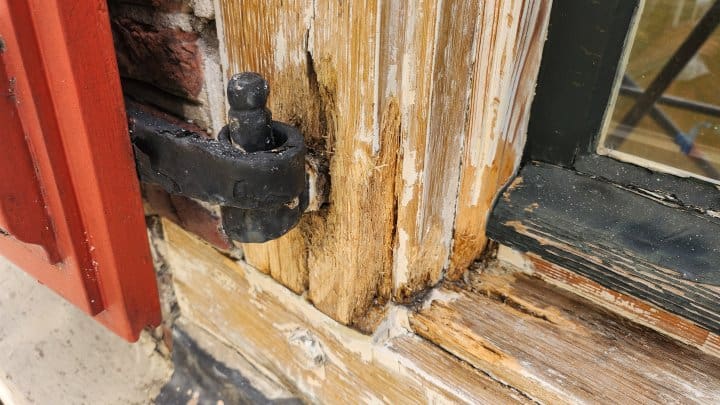 De kwaliteit van het houtwerk in de voorgevel volt tegen, Na het weghalen van de verf werden reparaties zichtbaar uit de tijd van de vorige restauratie, in de jaren 1980-1982.
