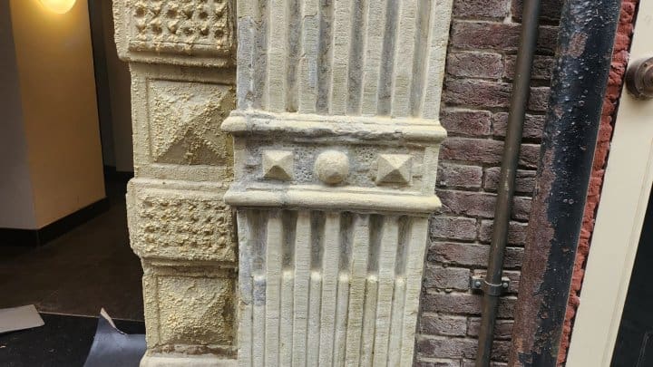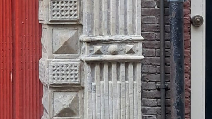 Natuurstenen kolommen bij de voordeur aan de Lokhorststraat. Ze zijn in het verleden niet erg zorgvuldig geschilderd. Om de oude verflagen te verwijderen is er een afbijtmiddel toegepast. Dat verklaart de “uitslag” op de linkse kolom.