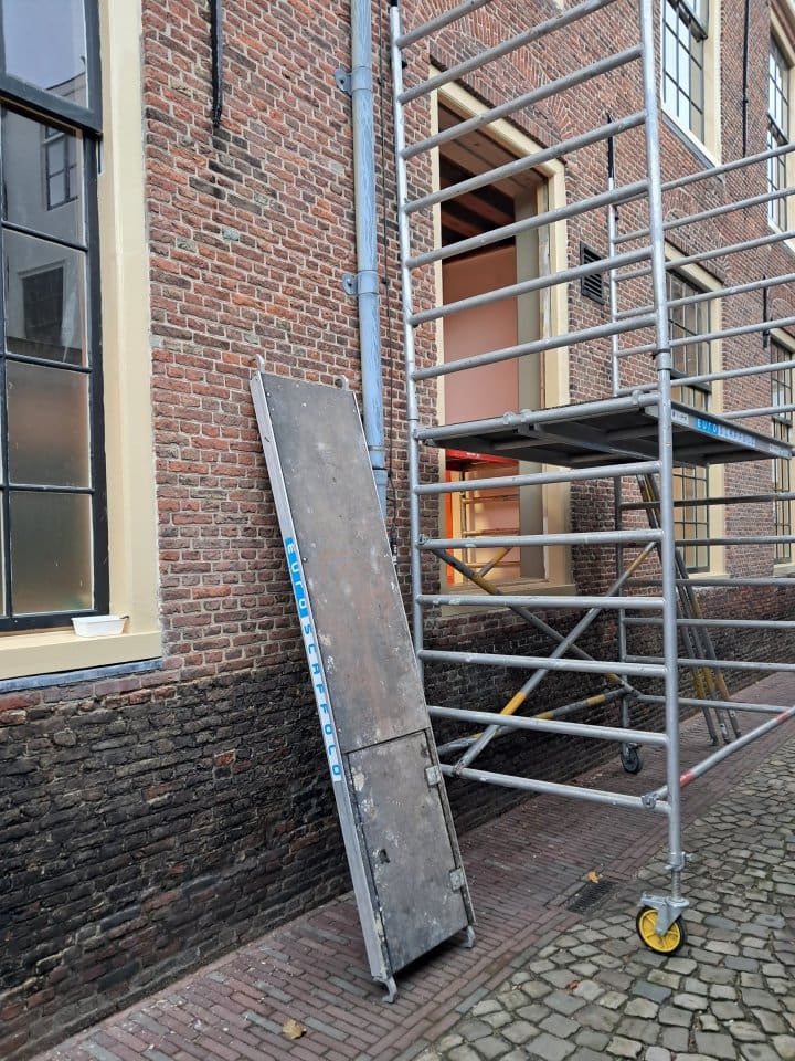 Aan de kant van de Schoolsteeg worden de laatste nieuwe ramen geplaatst.
