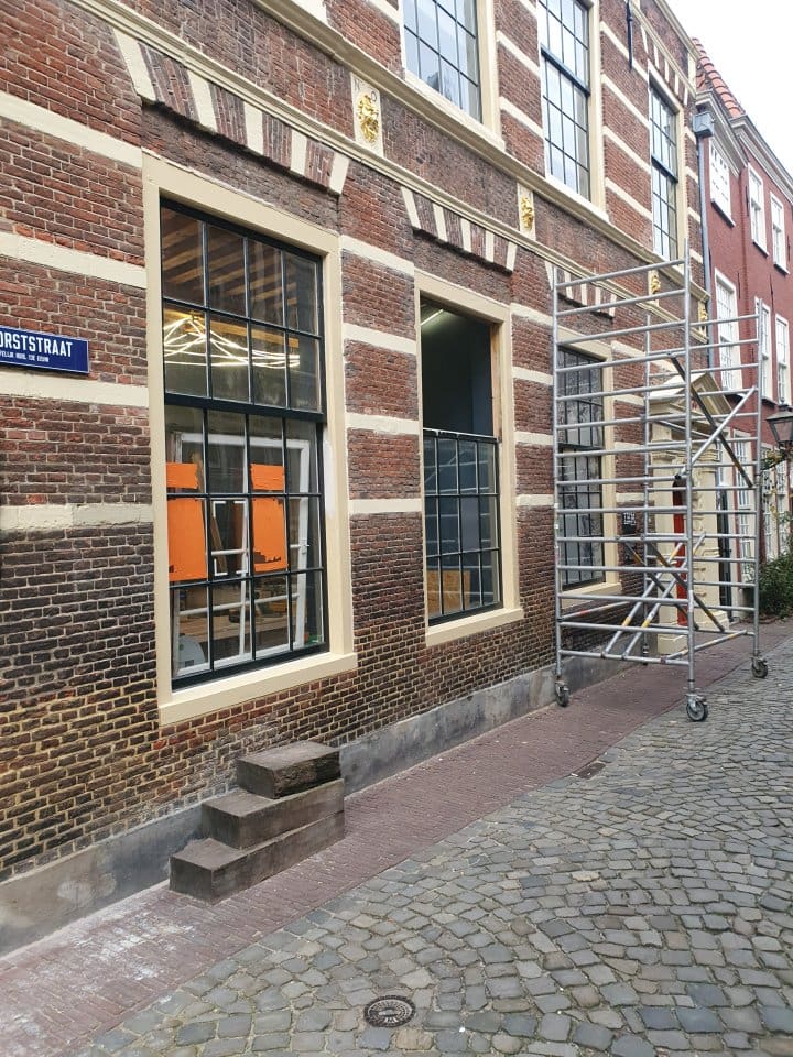 Volgens het oorspronkelijke plan zouden de uit 1982 stammende ramen in de voorgevel op de begane grond en de eerste verdieping gehandhaafd blijven en voorzien worden van achterzetramen. Na overleg is alsnog overeenstemming bereikt met Erfgoed Leiden en Omstreken over het plaatsen van nieuwe ramen met zeer goed isolerend vacuümglas. De achterzetramen kunnen nu vervallen. Vanwege de levertijd van het glas kunnen de werkzaamheden pas na de jaarwisseling worden afgerond. De nieuwe houten ramen zijn al wel geleverd; zie achter het linkerraam. Ter voorbereiding op de plaatsing worden ze ter plaatse precies passend in de bestaande kozijnen gemaakt.