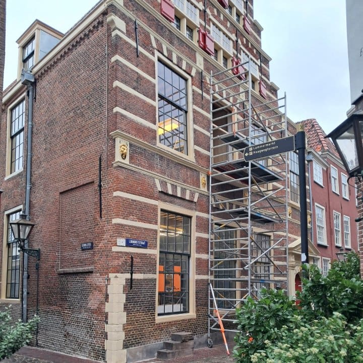 Aan de kant van de Schoolsteeg worden de laatste nieuwe ramen geplaatst.