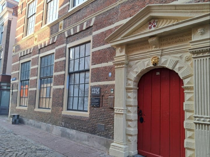 De toegangsdeur aan de kant van de Pieterskerkgracht wordt in de praktijk verreweg het meest gebruikt. Aan de buitenkant zal nog een glazen tochtportaal worden geplaatst.
